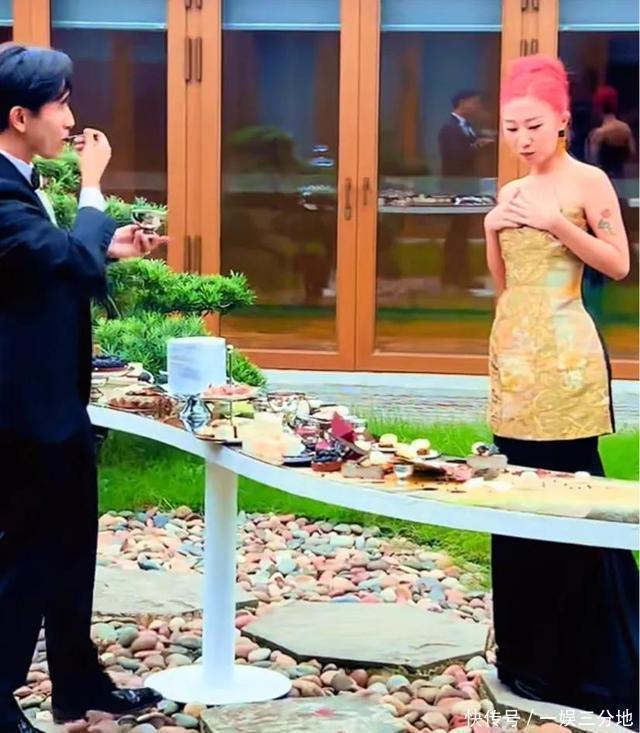 敬酒时刘一丝又换了一身金色礼服,这身礼服倒是跟红色头发很搭配,看着潮流很多。