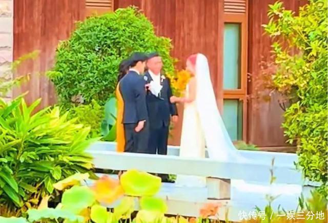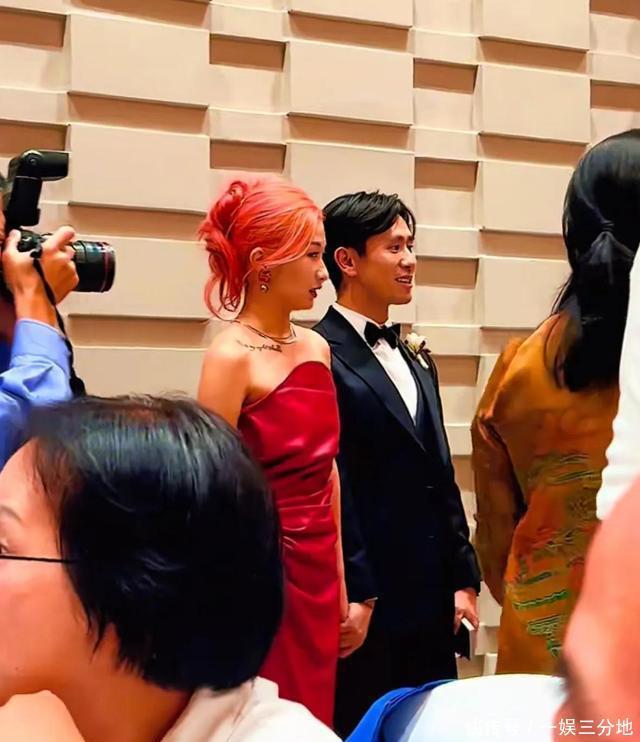 婚礼开始后,刘一丝先是穿上红色礼服拍照,只见她头发还专门染了一头红毛,看着真喜庆也真个性,真是继承了爸爸的艺术细胞。