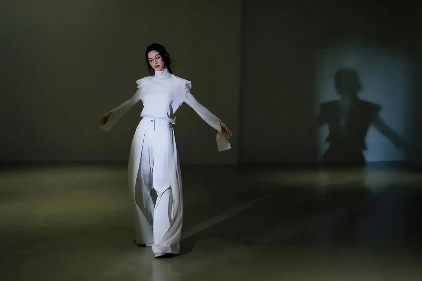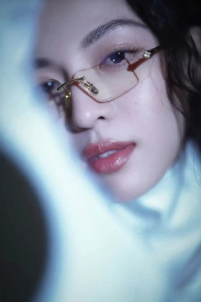 再瞧造型搭配的巧妙之处,卷发 + 无框眼镜堪称一绝!蓬松的卷发带着慵懒感,中和了白色缎面套装的凌厉感;无框眼镜则是点睛之笔,没有厚重镜框抢镜,却悄然增添了“高智感”,使整体造型从“纯飒”转变为“飒中带雅”,既有超模气场,又有知识分子的清冷气质。